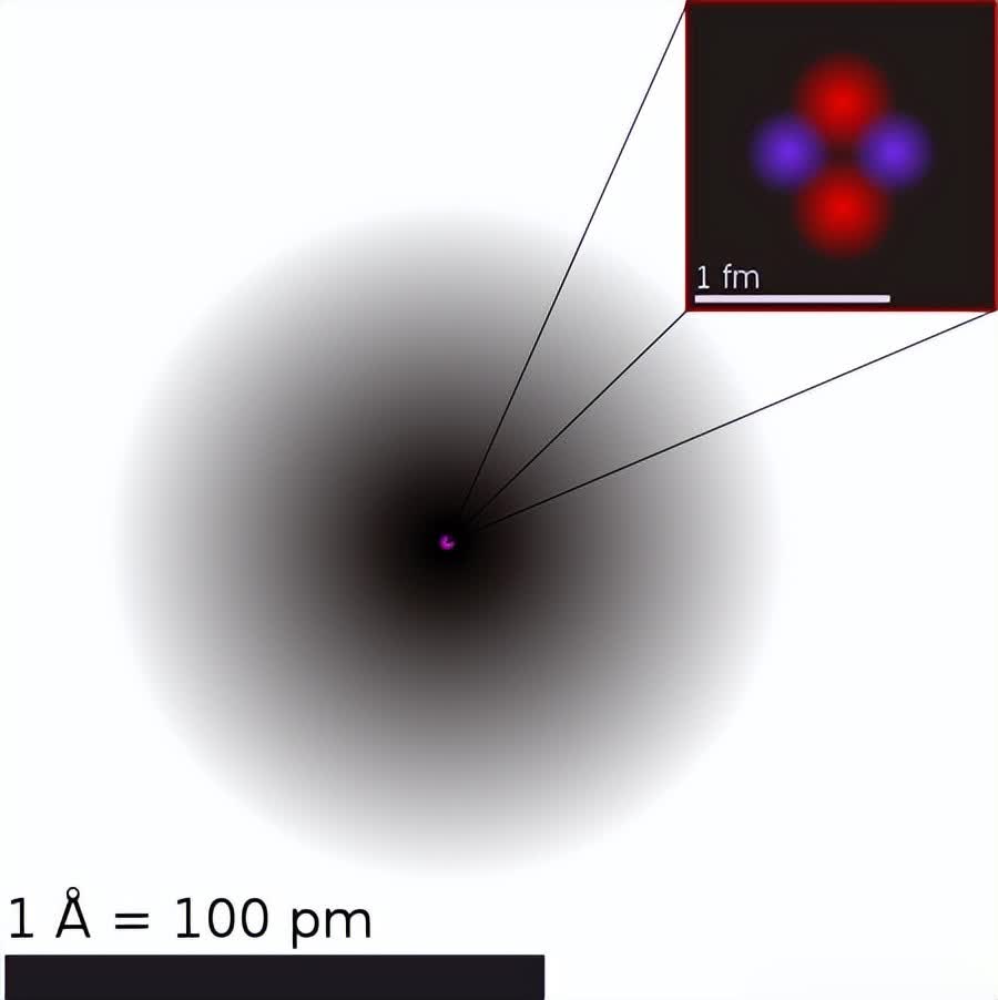氦原子结构示意图。图中灰阶显示对应电子云于1s原子轨道之概率密度函数的积分强度。而原子核仅为示意,质子以粉红色、中子以紫色表示。事实上,原子核(与其中之核子的波函数)也是球型对称的。 (对于更复杂的原子核则非如此)