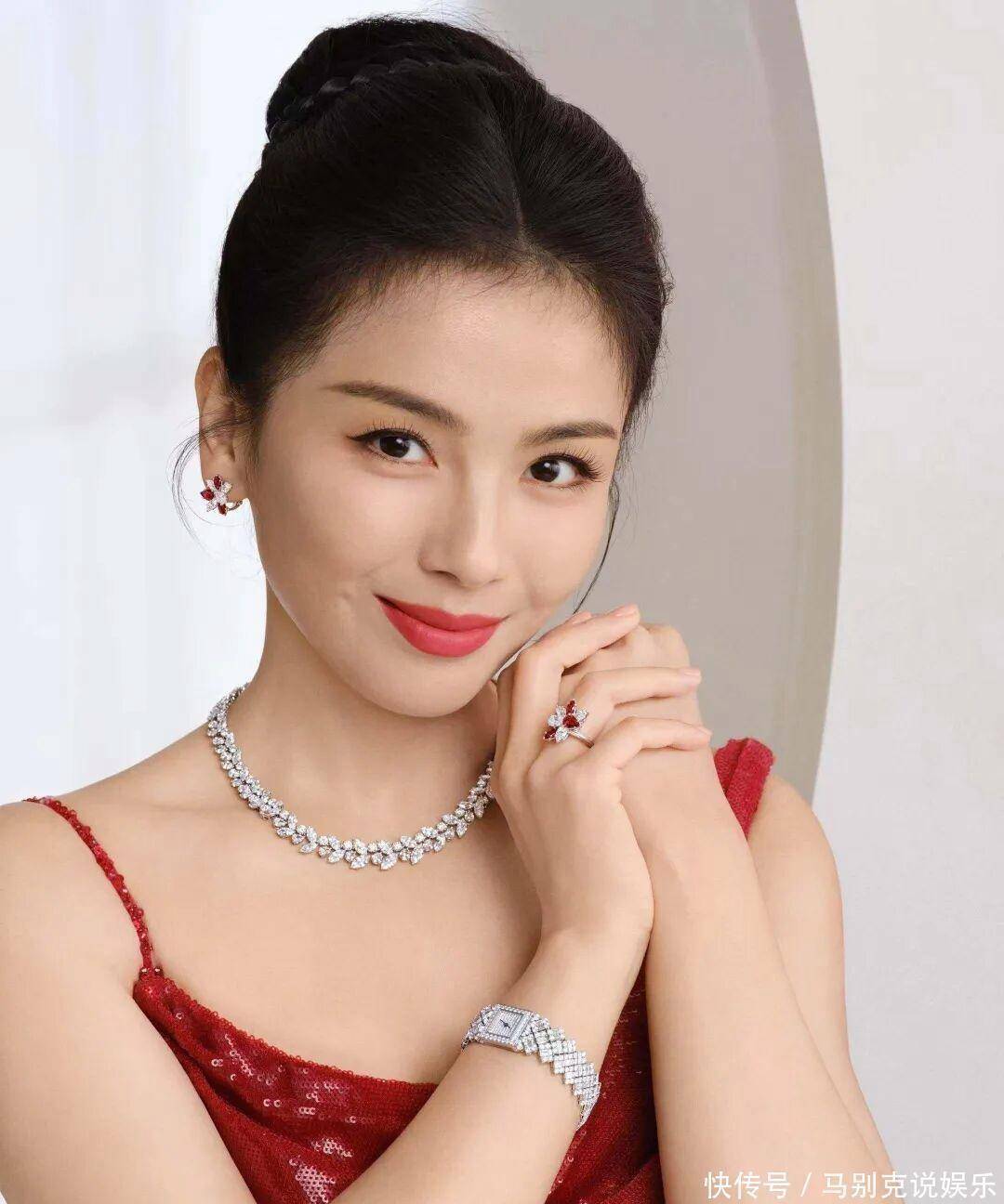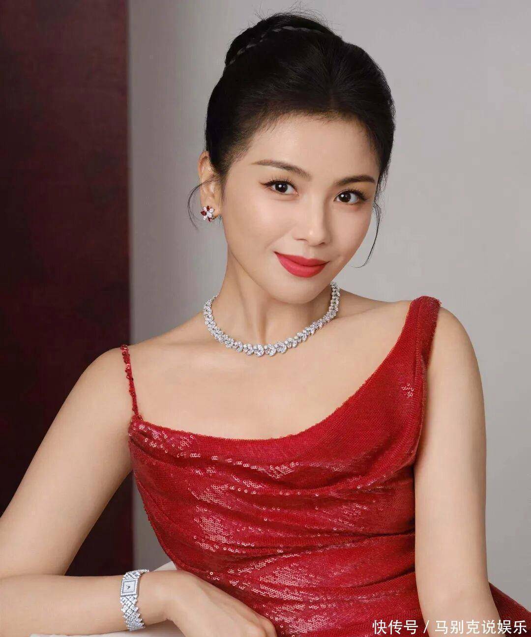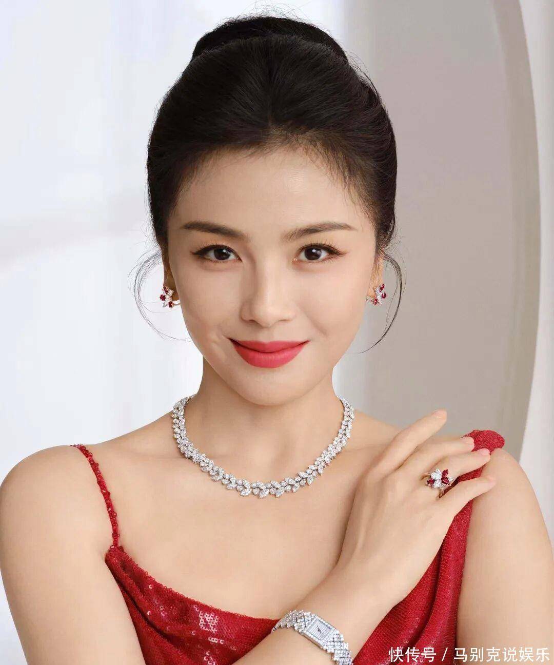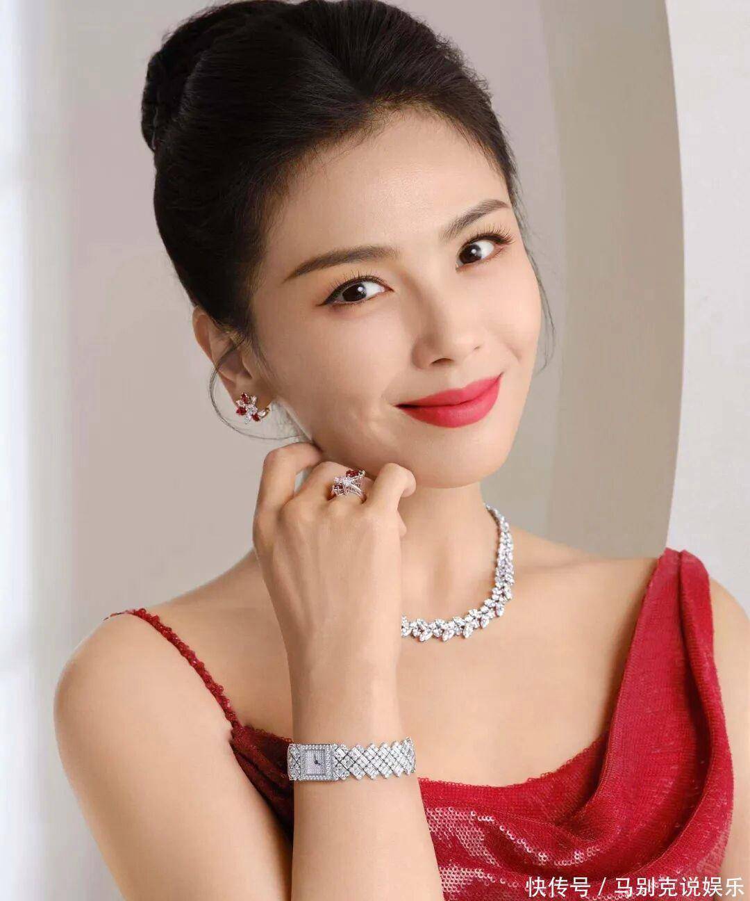 造型搭配更是相得益彰,点睛之笔莫过于高盘发与钻石珠宝的组合。利落高盘发将脖颈线条完全展露,显得干练又大气,搭配简约精致的钻石珠宝,低调奢华中透着满满贵气,与亮片红裙相互映衬,高级感瞬间翻倍。一抹红唇明艳饱满,衬得肌肤莹白透亮,瞬间提升气场,氛围感直接拉满。